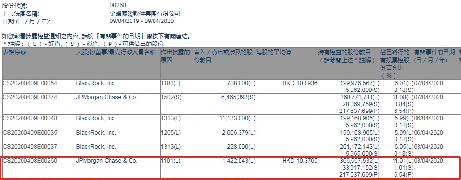 智通财经APP获悉,联交所最新资料显示,4月3日,摩根大通增持金蝶国际(00268)142.2043万股,每股作价10.3705港元,总金额约为1474.73万港元。增持后最新持股数目约为3.67亿股,最新持股比例为11.01%。