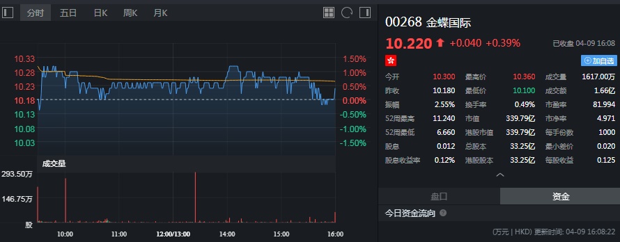 截至今日收盘,金蝶国际涨0.39%,报10.22港元。