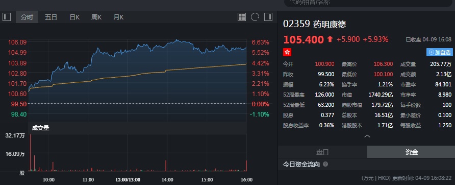 截至今日收盘,药明康德涨5.93%,报105.40港元。