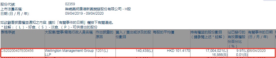 智通财经APP获悉,联交所最新资料显示,4月6日,Wellington Mgt减持药明康德(02359)14.0438万股,每股作价101.4170港元,总金额约为1424.28万港元。减持后最新持股数目约为1700.40万股,最新持股比例为9.97%。