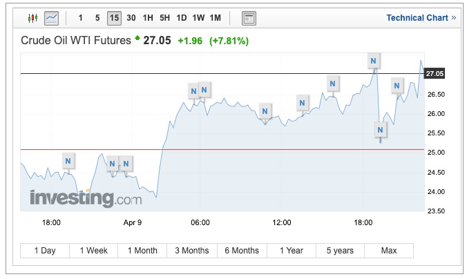 上述消息推动国际原油期货跳涨,在短短半小时左右,美国WTI原油期货的日内涨幅就从不到3%扩大到将近13%,升破28美元涨至28.36美元/桶;涨幅不到3%的布伦特原油一度涨幅逼近11%,最高涨至36.40美元/桶。