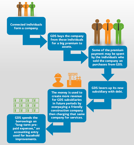 JCAP总结出的收入扩大方法如上图,简言之,即关联方成立新公司A,万国数据买下A公司,新增大额固定资产;万国数据举债扩大其新购入A公司的规模。