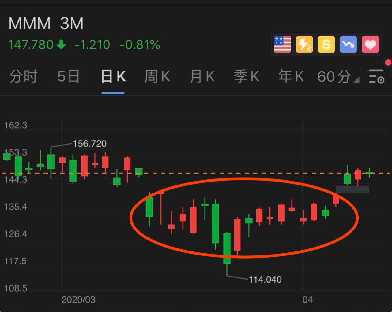 MMM是底部岛形反转,周五收了一根十字星,多空双方势均力敌,但最近几天机构筹码一直增加。大家注意128左右的筹码一直在增加,这个就是机构在买。3M的口罩销量大增,算是不错的催化剂。稳妥点的可以,可以等突破150美元再去买入。