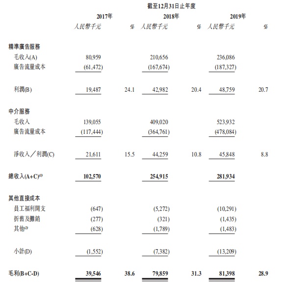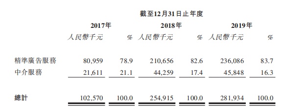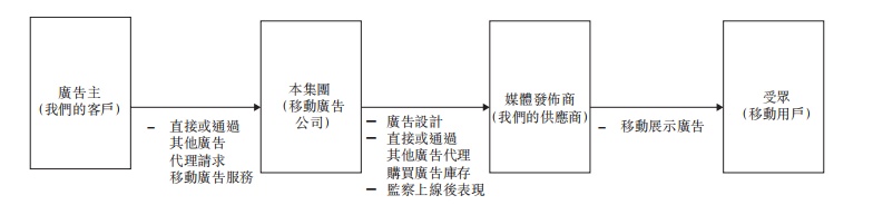 中介服务的广告通常将植入由媒体发佈商营运的移动应用程序接口的广告位,并以与应用程序用户界面或应用程序信息流一致的形式显示。该等广告可以不同形式发送,包括动态消息广告及应用程序商店广告。公司于2018年4月前后将广告服务扩展至视频形式广告。