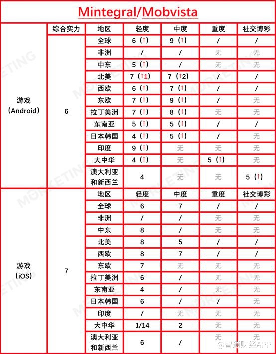 根据AppsFlyer给出的各大细项分析发现,Mintegral在2019年全年中保持了超高速的增长,除去非洲地区,几乎在全部所有区域市场的轻度和中度游戏领域,Mintegral都从2019年上半年未上榜状态跃升至榜单前十。