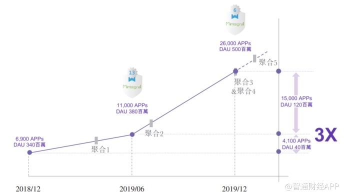 2018年12月时,Mintegral触及的APP为6900款,DAU为3.4亿。而至2019年12月时,Mintegral触及的APP增至2.6万款,DAU增至5亿,无论是触及的APP数量还是DAU,均实现了爆发式增长。而据公司披露的数据显示,在2019年下半年新增的APP及DAU数量是上半年的3倍以上。可见,接入主流聚合平台对Mintegral的裂变起关键作用。
