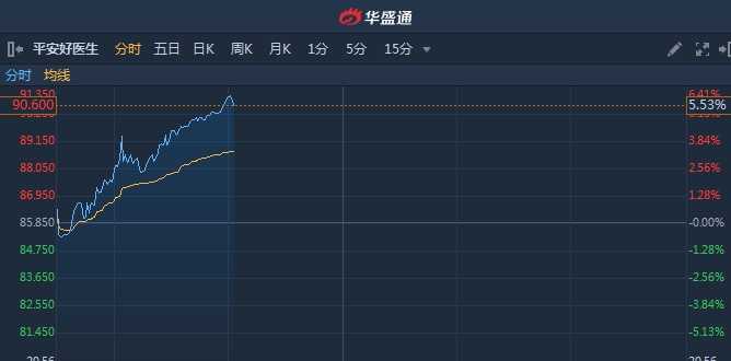 智通财经APP获悉,平安好医生(01833)盘中涨幅扩大至6.64%,高见91.55港元再度破顶。截至午间收盘,涨5.77%,报价90.8港元,成交额3.42亿。