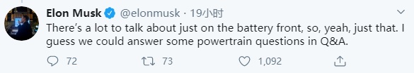 马斯克在Twitter上说:“光是在电池方面,我们就有很多话要说。所以,是的,我们只会谈论电池。但我想我们可以在提问环节回答一些动力传动系统的问题。”