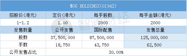 智通财经APP获悉,4月14日,MOG HOLDINGS(01942)配售结束。配售招股价1-1.2港元,最终定价1.0港元,每手2000港元。