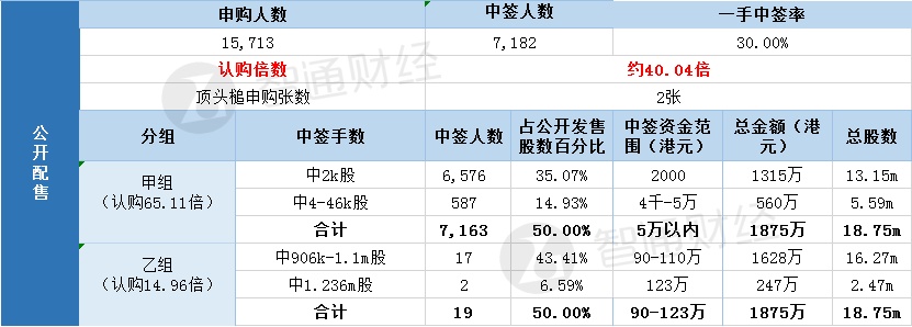 其中,公开配售申购人数15713,一手中签率30%,认购倍数约40.04倍。