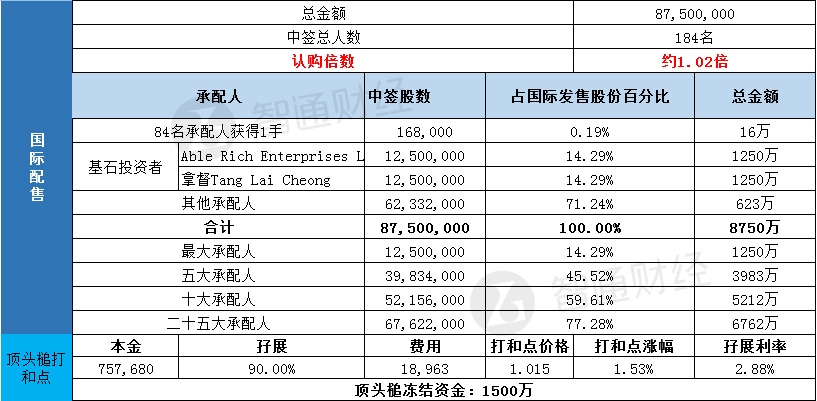 国际配售申购人数未披露,认购倍数约1.02倍。