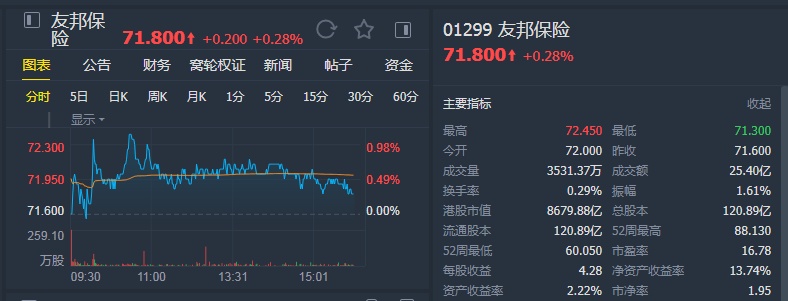 该行指出,友邦估值上升空间有限,将今年新业务价值预测调低4%,净资产收益率预计为14.5%,更看好“纯中国股”,重申其“跑输大市”评级,目标价由76港元下调至71港元。