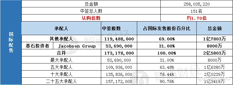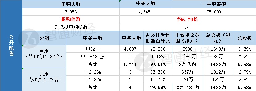 其中,公开配售申购人数15956,一手中签率25%,超购倍数约6.79倍。