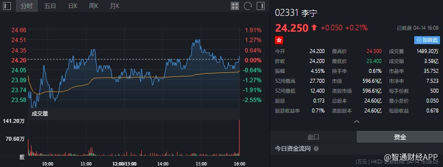 智通财经APP获悉,截至今日收盘,李宁涨0.21%,报24.25港元。