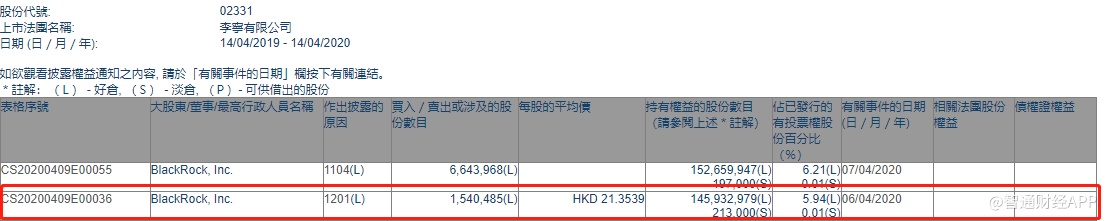 智通财经APP获悉,联交所最新资料显示,4月6日,贝莱德减持李宁(02331)约154.05万股,每股作价21.3539港元,总金额约为3289.57万港元。智通财经APP获悉,减持后最新持股数目约为1.46亿股,最新持股比例为5.94%。