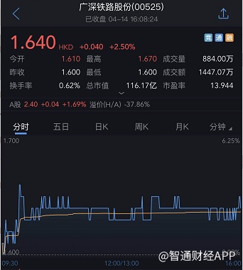 截至今日收盘,广深铁路股份涨2.50%,报1.64港元。