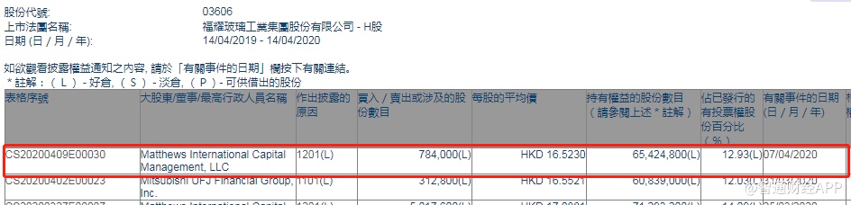 智通财经APP获悉,联交所最新资料显示,4月7日,Matthews International Capital减持福耀玻璃(03606) 78.4万股,每股作价16.523港元,总金额约为1295.40万港元。减持后最新持股数目为6542.48万股,最新持股比例为12.93%。