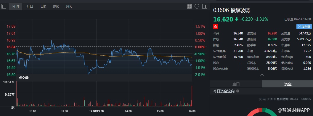 截至今日收盘,福耀玻璃跌1.31%,报16.62港元。