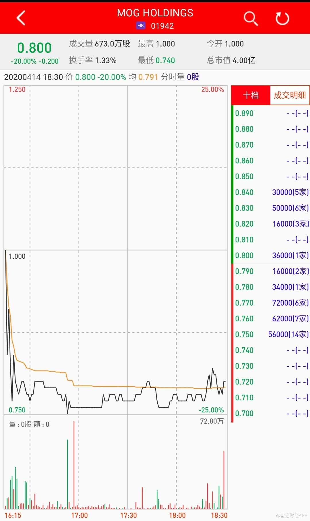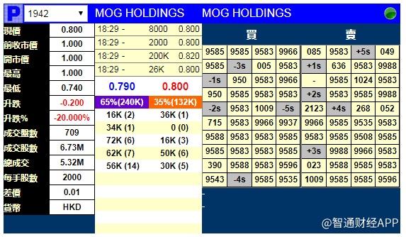 智通财经APP获悉,MOG HOLDINGS(01942)将于4月15日挂牌,截至收盘,辉立证券暗盘交易显示其报价0.8港元,较招股价1港元跌20%。每手2000股,不计手续费,每手亏400港元。