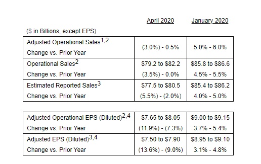 强生表示,受卫生事件影响,公司将全面下调2020全年业绩指引,预期2020全年公司的运营销售额在792-805亿美元之间,同比降低3.5-0%。预期全年经调整摊薄后的每股收益在7.50-7.90之间,同比降低13-9%,此前预期同比增长3.1-4.8%至8.95-9.10美元。