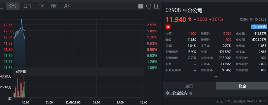 截至发稿,中金公司涨0.67%,报11.94港元。