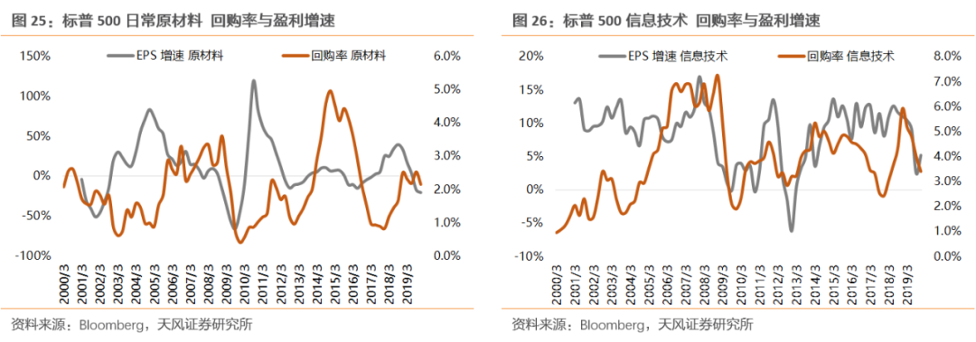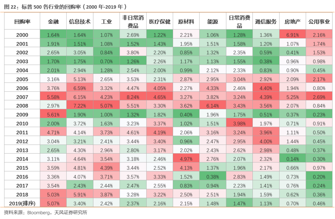 2019年回购率前五的行业为:金融(5.07%,1900亿美元)、信息技术(3.40%,2200亿美元)、工业(2.42%,618亿美元)、非日常消费品(2.37%,685亿美元)、医疗保健(2.16%,839亿美元)。从各行业的回购率与盈利趋势看,多数行业的回购呈现顺周期特征,且拐点略滞后于盈利周期。