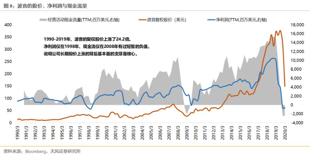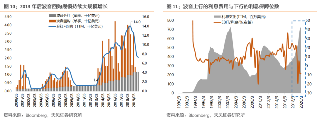 问题三:分红与回购是否一种健康与可持续的方式?适当的分红或回购是股东权益最大化的一种理性选择。因多数公司新增投资项目的ROE低于现有资产,特别是成熟企业,通过分红或回购可以减缓ROE下滑的斜率。(2)波音:激进的回购可能埋下隐患客观地讲波音长期股价上涨的支撑是基本面。1990-2019年,波音的复权股价上涨了24.2倍。股息率+回购率两者合计贡献股价3.2倍的涨幅。但迅速增长的分红与回购可能埋下了债务隐患。2013-2019年间回购总金额达643亿美元,大量回购使得公司的净资产从2017年开始转为负值。