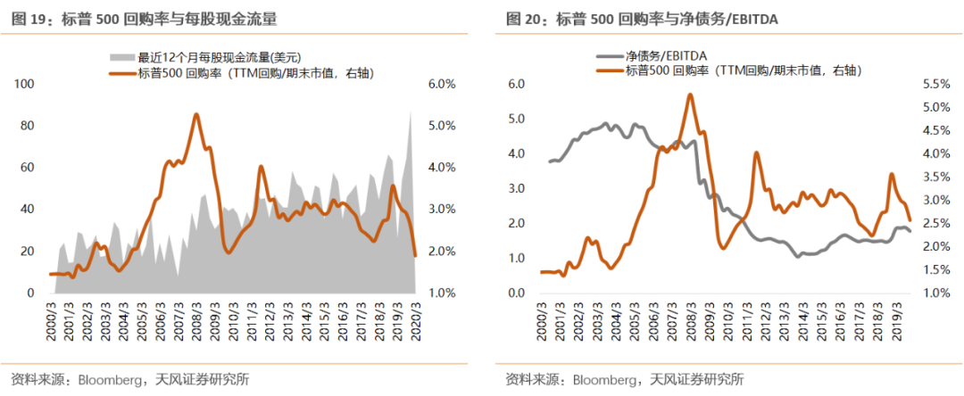 到了2019年,标普500成份股的回购总规模为7350亿美元,较2018年的7980亿美元有所回落。另外,2019年的回购率(TTM回购金额/期末市值)为2.6%,也小于2018年的3.6%。2018年以来,美股回购规模的先升后降,反应了减税降费的措施使得企业的盈利增加(分红回购增加的同时,未分配利润也有所增加,比如可口可乐和波音),但当前的投资环境并没有得到实质性改善。如我们第一部分分析到的,如果企业不认为新的投资活动能够使这些利润获得更大的升值空间,那么分红或回购也就成为一种相对理性的选择。
