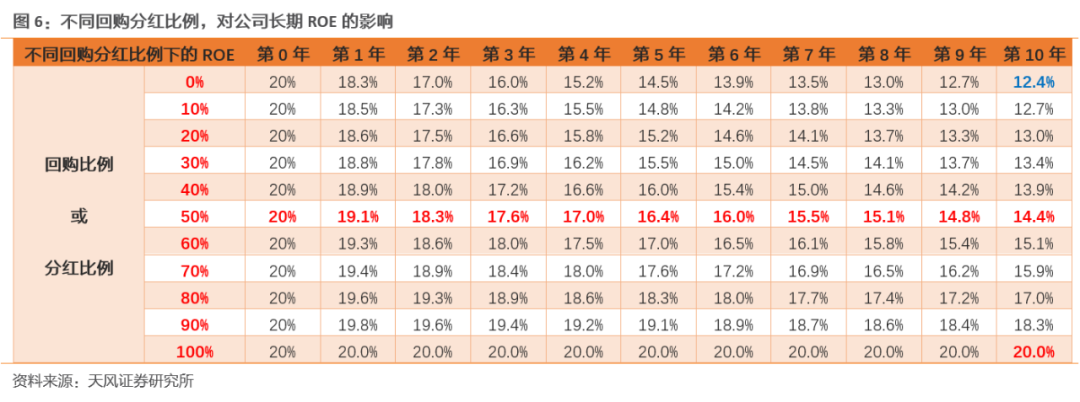 假设期初公司的ROE为20%,若新增项目的ROE长期保持20%(假设保持同样的债务结构),则公司的整体ROE自然维持在20%水平。若新增项目ROE低于原来资产,为10%,则到了第10年,公司整体的ROE降为12.4%,长期则向10%收敛。若新增项目ROE高于原来资产,为25%,则到了第10年,公司整体的ROE升至24.5%,长期向25%收敛。