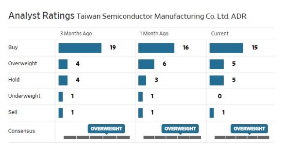 截至4月14日收盘,年初至今,该股累跌12.36%。自1月以来,分析师对台积电的看法略有变化,但幅度不大。当时有29位分析师覆盖该股,其中23位给出了“买入”评级,4位给出“持有”,仅有2位给出“卖出”评级。而目前,26位分析师中有20位给予“买入”,5位给予“持有”,仅有1位给予“卖出”评级。