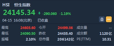 智通财经APP获悉,恒指早盘高开64.46点或0.26%,报24499.86点。截至收盘,恒生指数跌290.06点或1.19%,报24145.34点,全日成交额达1120.68亿。国企指数跌1.25%,报9724.7点,红筹指数跌1.93%,报3720.12点。