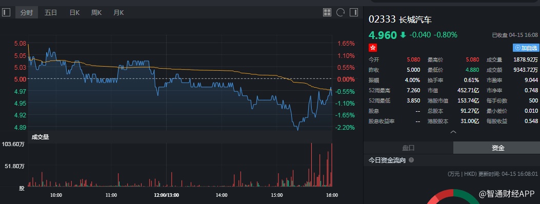 截至发稿,长城汽车跌0.80%,报4.96港元。