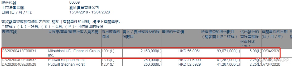 智通财经APP获悉,联交所最新资料显示,4月9日,三菱日联金融集团增持创科实业(00669)216.8万股,每股作价56.0061港元,总金额约为1.21亿港元。增持后最新持股数目约为9307.1万股,最新持股比例为5.08%。