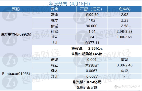 智通财经APP获悉,康方生物-B(09926)和Rimbaco(01953)正在招股中,截至4月15日,辉立、耀才以及信诚等分别为其借出约2.58亿元和0.14亿元。其中,康方生物-B孖展超额认购逾145倍,Rimbaco认购未足额。