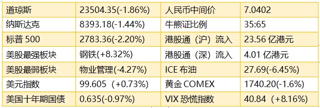 1、隔夜美股收盘普跌,道指收跌1.85%,纳指收跌1.44%,标普500指数收跌2.19%。石油股和银行股领跌。按比例计算,港股恒生指数ADR收报23937点,跌207.58点或0.87%。亚特兰大联邦储备银行行长Raphael Bostic表示,面对公共卫生事件引发的封锁措施,许多美国企业最早将在下个月陷入挣扎求生的境地。