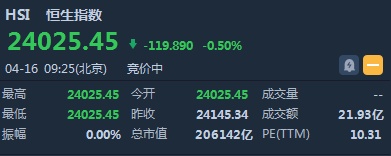 智通财经APP获悉,恒生指数开盘跌119.89点或0.5%,报24025.45点。国企指数跌0.56%,报9670.61点。红筹指数跌0.6%,报3697.64点。大市盘前成交21.93亿港元。