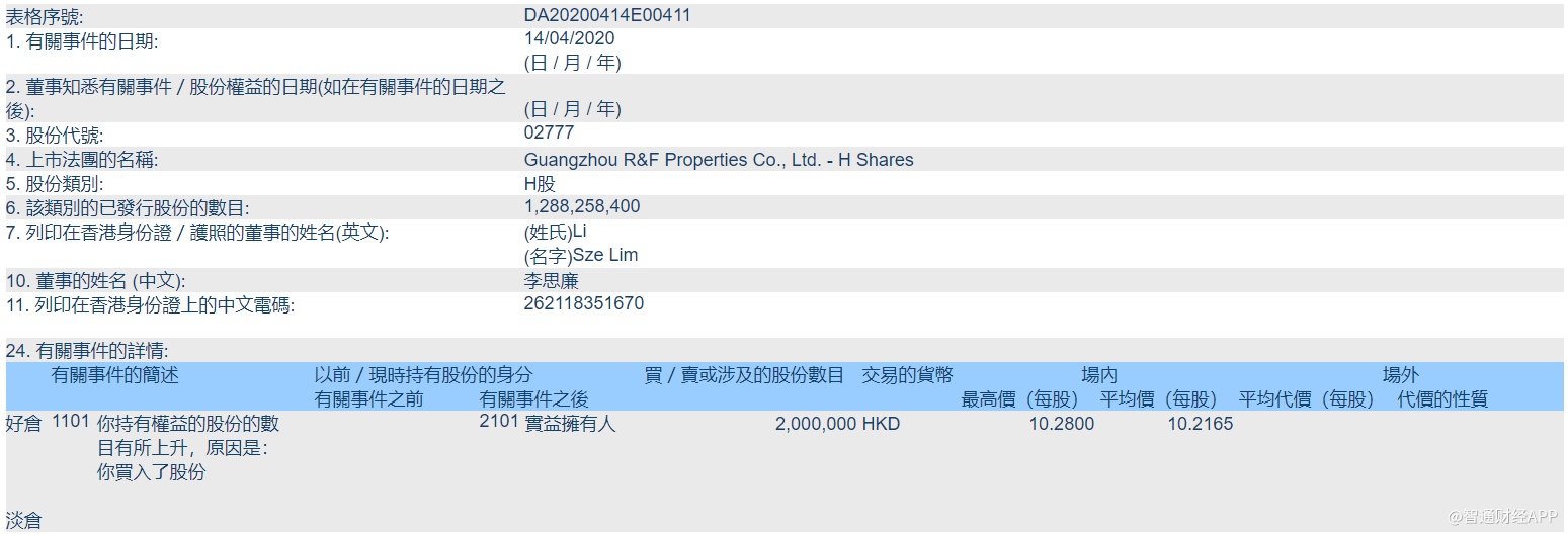 智通财经APP获悉,据披露易显示,富力地产(02777)联席董事长兼执行董事李思廉于4月14日买入公司200万股股份,买入均价约为10.22港元,涉资2043.3万港元。交易完成后,李思廉在富力地产H股流通股的持股比例从3.03%上升至3.18%。另外据富力地产2019年年报显示,李思廉还持有富力地产29.90%的内资股。