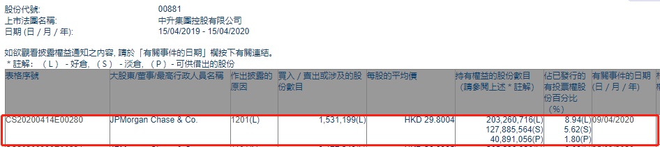 智通财经APP获悉,联交所最新资料显示,4月9日,摩根大通减持中升控股(00881)153.1199万股,每股作价29.8004港元,总金额约为4563.03万港元。减持后最新持股数目约为2.03亿股,最新持股比例为8.94%。
