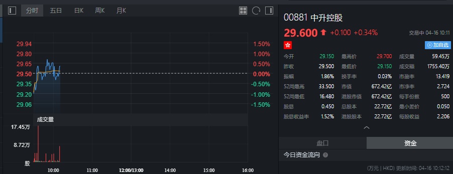 截至发稿,中升控股涨0.34%,报29.60港元。