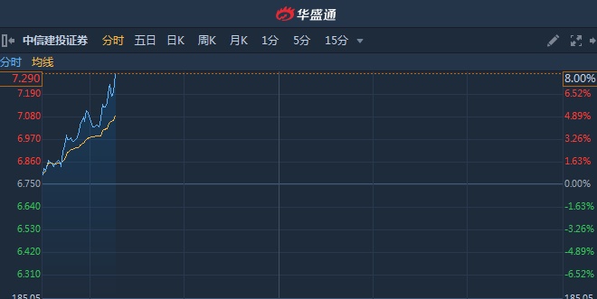 智通财经APP获悉,中信建投证券(06066)早盘再获市场热捧,盘中A股涨超9%,H股跟涨逾8%。截至10时15分,涨8%,报价7.29港元,成交额1.28亿。