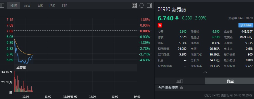 截至发稿,新秀丽跌3.99%,报6.74港元。