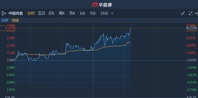 智通财经APP获悉,中粮肉食(01610)午后涨幅扩大,盘中突破120日均线,近期获国盛证券看高至3港元,维持“买入”评级,截至14时14分,涨6.22%,报价2.22港元,成交额9823万。