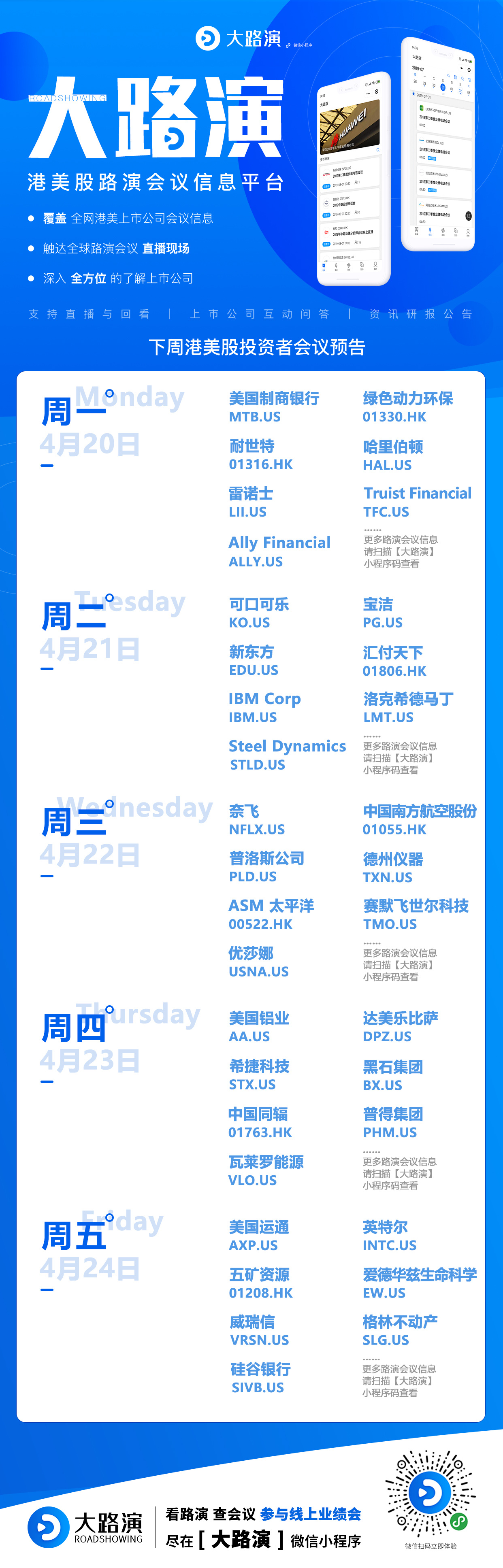 以下是智通财经“大路演”为您整理的下周(4月20日-4月24日)港美股上市公司会议日历。