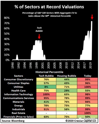 西泽资本表示,通过呈现当前市场估值极端的严重风险,从而认识到美股市场下滑在即的方法。聚焦于标准普尔500指数的每一个板块,并将其今天的估值与2000年和2007年科技股和房地产泡沫时期的市场高峰相比较。可以看到一个史无前例的现象:在11个行业中,有8个行业(标红)估值处于历史最高值前列,呈现出当前过度的市场广度。