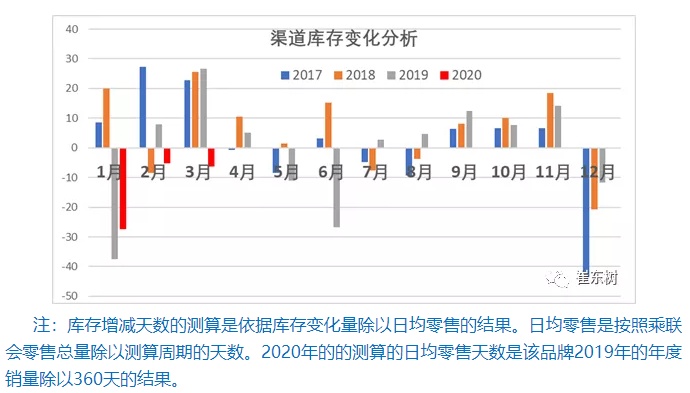 德系品牌走势相对稳定,2019年增加两天库存,2020年1-3月份下降2天库存,总体19~20年渠道库存减少两天库存安全量。