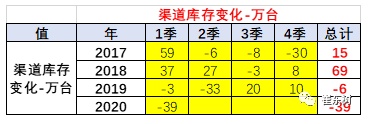 2020年的1月份由于零售远大于厂家批发销量,所以形成27万台的去库存特征。2月又出现6万台去库存特征,1-3月总体渠道去库存39万台。
