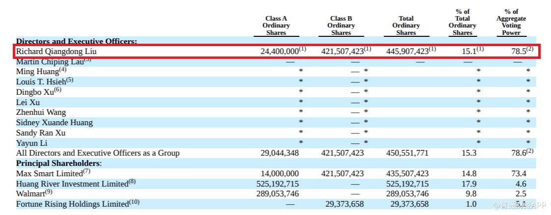 刘强东共持有2440万股A类普通股,以及421507423股B类普通股,占总流通股股本的15.1%,以及投票权的78.5%。根据京东递交的2018年财报显示,截至2019年2月28日,刘强东本人持有15.4%的股权,并拥有79%的投票权。