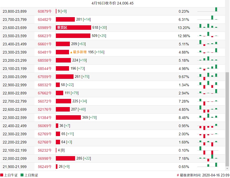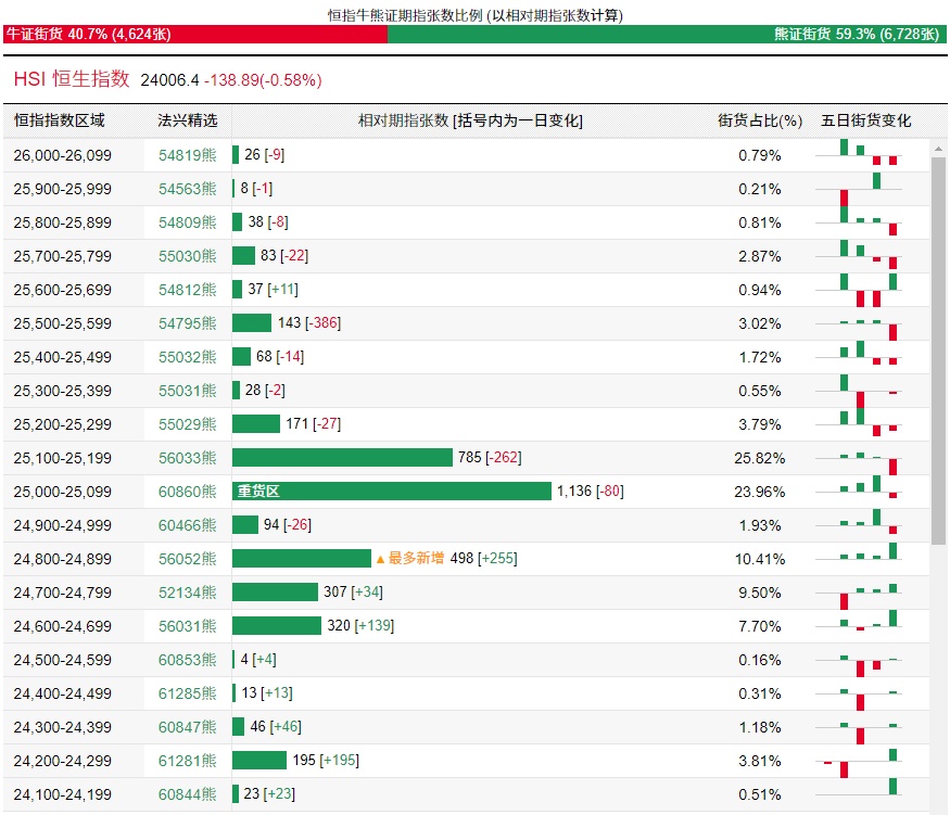 智通财经APP获悉,截至4月16日,恒指最新的牛熊街货比例41:59。法兴恒指牛熊证街货分布图中的数据显示,熊证街货重货区在25000-25099区间,该区间最新熊证数量为1136张,较上一交易日减少80张,最多新增在24800-24899区间,该区间最新熊证数量为498张,较上一交易日增加255张。牛证街货重货区在23600-23699区间,该区间最新牛证数量为518张,较上一交易日增加30张,最多新增在23300-23399区间,该区间最新牛证数量为195张,较上一交易日增加156张。