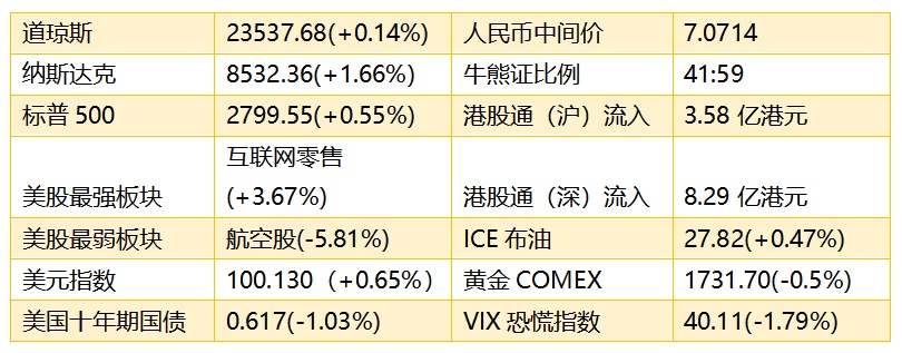1、隔夜美股标普500指数涨16.2点,涨幅0.58%;纳指涨139.2点,涨幅1.66%,报8532.36点;道指涨33.3点,涨幅0.14%,报23537.68点。华尔街多家大型投行普遍担忧卫生事件冲击经济,衰退料持续至明年,加上美国首次申领失业救济人数持续超过500万,美股道指受压;亚马逊(AMZN.US)与奈飞(NFLX.US)股价则再度创新高,推动纳指反弹。港股ADR指数表现偏软,按比例计算,收报23925点,跌81.45点或0.34%。