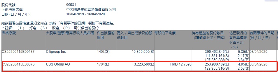 智通财经APP获悉,联交所最新资料显示,4月8日,UBS Group AG减持中芯国际(00981)322.35万股,每股作价12.7695港元,总金额约为4116.25万港元。减持后最新持股数目约为2.54亿股,最新持股比例为4.95%。
